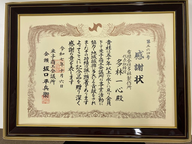 令和7年10月6日 米子商工会議所表彰式に於いて、永年会員加入事業所(加入50年)と優良従業員(勤続10年1名)の表彰を受けました。